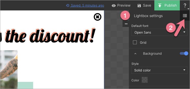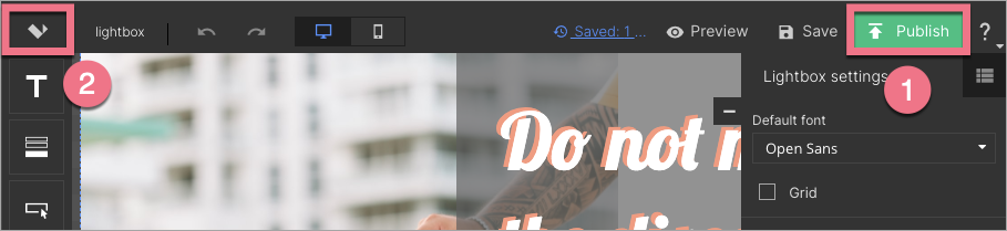 8. When your lightbox is ready, click the Publish (1) button and then exit the editor (2).