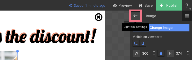 7. When editing, you will find there a toolbar with settings of added widgets. To go back to the lightbox settings, click on the arrow.
