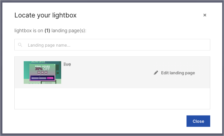 Go to the Lightboxes tab to find which landing page your lightbox is connected to. Hover over the lightbox and click Locate lightbox.