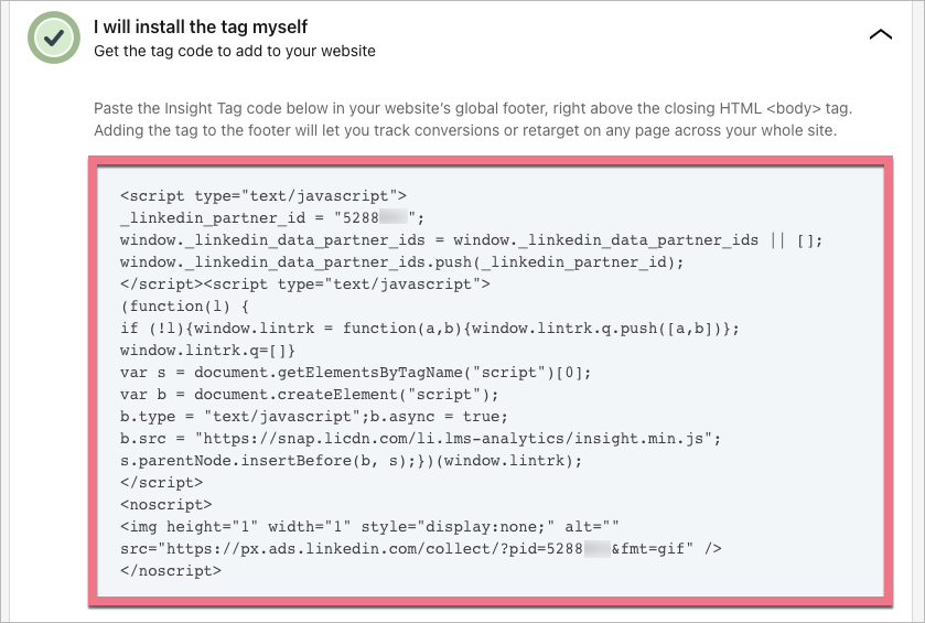LinkedIn Insight Tag is a code that you add to your landing page to use LinkedIn features like website retargeting, conversion tracking, and website demographics. It helps you to boost the relevance of your LinkedIn ads to your audience. It works similarly to a Facebook pixel.