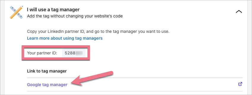 5. Choose how to install the tag. You can use a tag manager, e.g., Google Tag Manager. To do so, click the relevant link to jump into the instructions. Copy your partner ID as it is needed for the installation.
