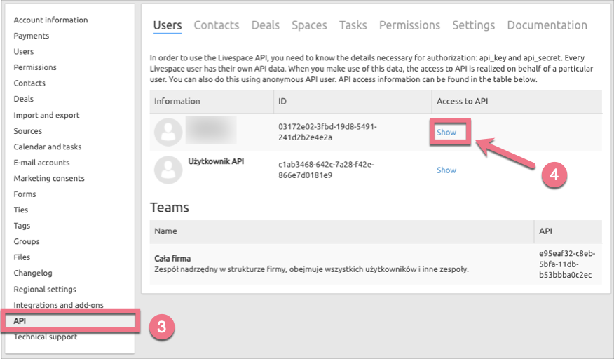 2. Choose API (3) from the left panel. Click Show (4) next to the desired username.