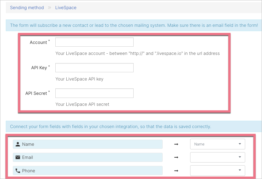 3. Fill in the required data. Paste the name of your LiveSpace account, API key, and API secret. Once you have done it, connect form fields with fields in the integration.