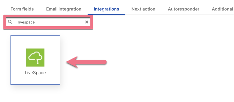 2. In the Integration tab, find LiveSpace. You can use the search bar to look for the integration. Type the name and press enter.