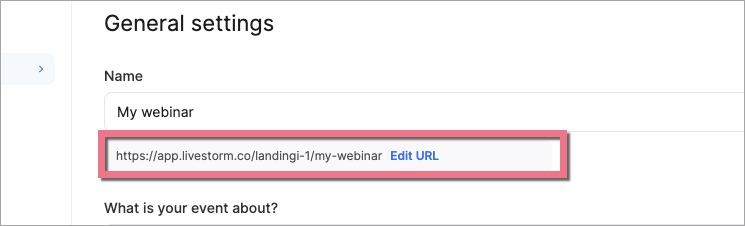 4. Go to General settings (1) and copy your event URL (2). In Optional settings (3), you can personalize, e.g., the design of the registration page or event room settings.