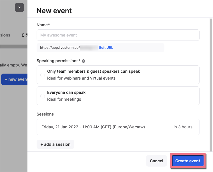 3. Fill out the fields needed to create your event, then click Create event.