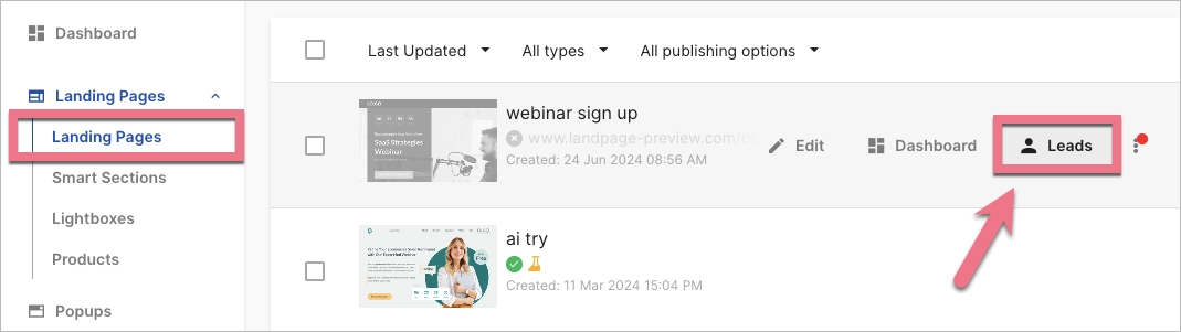 Go to the Landing Pages tab, hover over your page, and click on Leads. You’ll be taken to the Leads tab, but only with the leads for this specific page. You can view the lead statistics and conversion rate from the Dashboard of the landing page.
