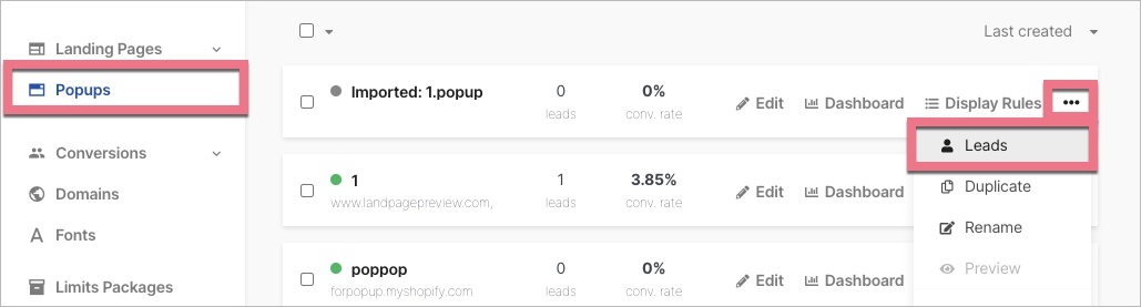 Navigate to the Pop-ups tab, click on More (three dots icon), and select Leads. Again, you’ll be taken to the Leads tab. You can view the lead statistics and conversion rate from the Dashboard of the pop-up.