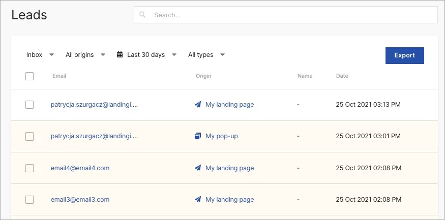 Here, you will find a list of all your leads collected on landing pages (and lightboxes) and pop-ups. The highlighted leads are unread leads.