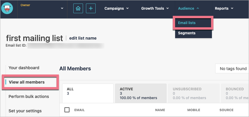 To find your leads in Moosend, go to the Audience tab, select Email lists and choose your list. Then click View all members.