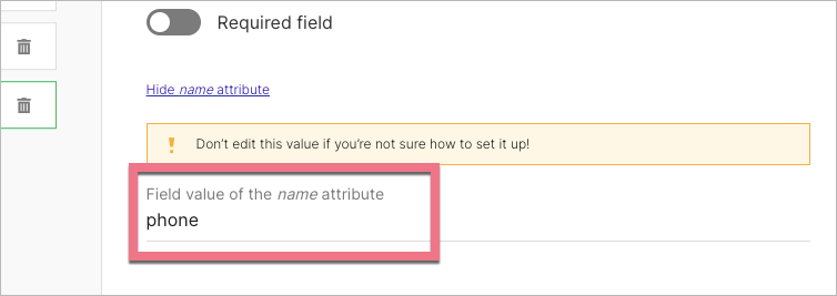 When you connect a tool with Landingi, the name attribute adjusts to the integration – not the other way around. It means that after you integrate your form with an external tool, the tool will overwrite (change) the name attribute and assign it its own value. The name attribute will remain as the integration impose. As a user, you are not able to change it in the integration as long as the tools are connected.