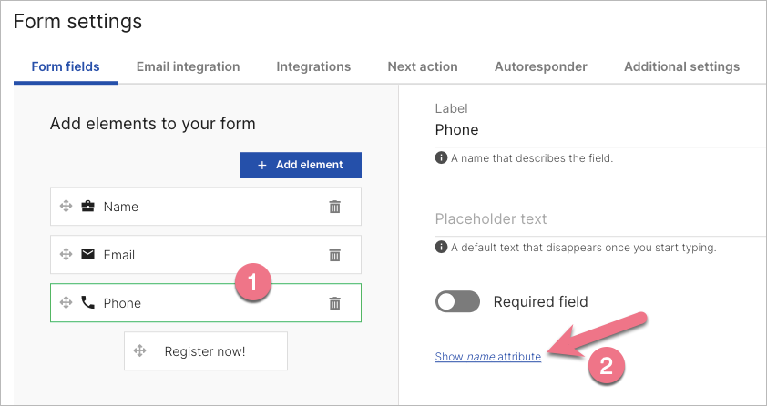 2. In the Form fields tab, select a field (1) and click Show name attribute (2).