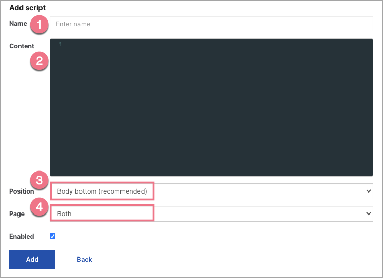 3. Type in a name (1), paste your code (2), and select Body Bottom (3) and Both (4). Click on Add.