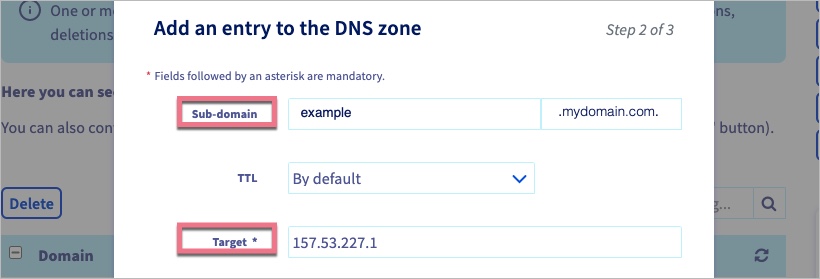 1. Add an A record for the subdomain you want to add to Landingi. If you already have such a record, edit (Modify) it.