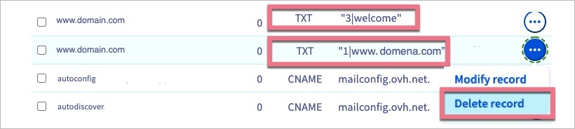 1. Remove the two default TXT records for the www subdomain with the values “3|welcome” and “1|www.domain.com“. Check both pages of the record list.