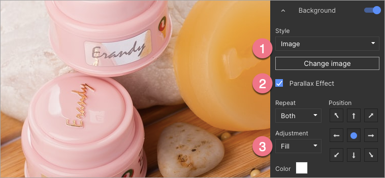 4. Choose Image as a style and click Change image (1) – you can upload your image or use one from our free gallery. Then select Parallax Effect (2) and set the adjustment to Fill (3).