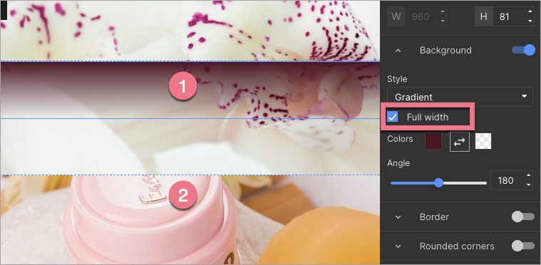 5. Add other sections. For each section, set the Background and select Full width. You can choose any background style, for example, gradient (1), image (2), full color, or video.