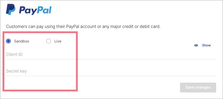 3. In the PayPal section, paste your Client ID and Secret key and select Sandbox for test transactions, or Live if you want to launch an actual sale. Remember that the settings selected in this section must match the settings in your PayPal account panel.