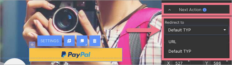 6. In the right-side toolbar, find the Next Action tab where you can specify an action after the payment has been made. By default, the user will be redirected to a thank you page (Default TYP), but if your landing page has multiple payment gateways or other signup forms, you can create and link a landing page that displays only after a transaction is completed (URL).
