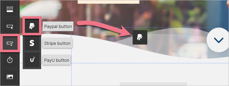 4. Now you can add a buy button to your landing page. On the left side of the editor, hover over the Pay buttons, then choose the Paypal button and drag and drop it into the active area of your landing page. Go to its Settings.