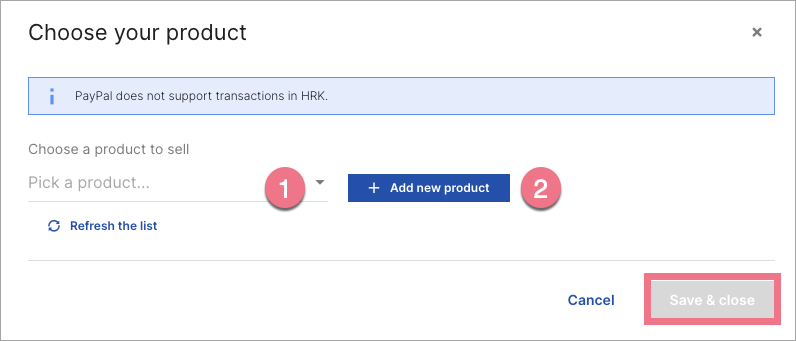5. Select a product from the list (1) or add a new one (2) and refresh the list to link it to this payment gateway. Click Save & close. You can only add one product to a single payment gateway button.