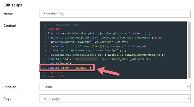 3. Name the script and paste the tag in the Content field. Choose the Head position on the Man Page. Then click Add.