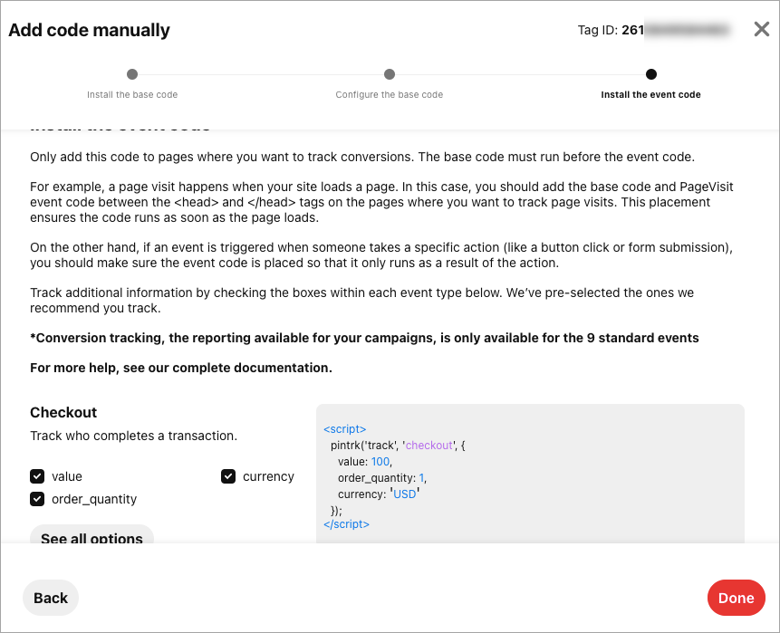 - base code – it is the foundation of the Pinterest tag; it has to be placed on every page of your website;