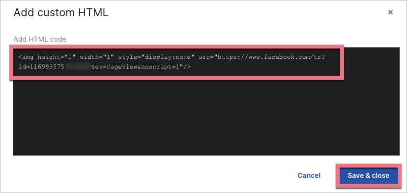 During the general set-up of your Meta pixel (base code), copy the snippet with its URL address. It should look like this: <img height=”1″ width=”1″ style=”display:none” src=”https://www.facebook.com/tr?id=001100&ev=PixelLead&noscript=1%22/ >.