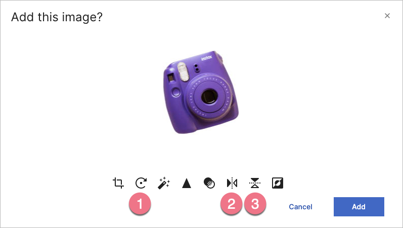 4. In the editing window, you can rotate (1), mirror (2), or flip (3) the image. To save the changes, click Add.