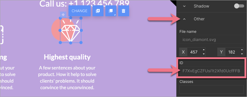 2. Click on a chosen element and find its ID in the Other tab in the right-side toolbar. Copy the ID.