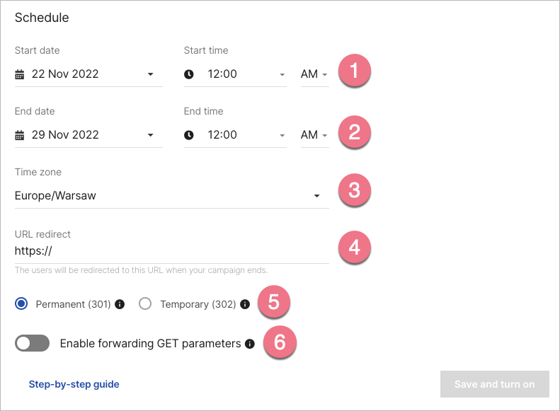 With the campaign scheduler, you can automatically launch and stop your campaign at a specific time without having to manually disable the landing page. You can also use the scheduler to set up 301 or 302 redirects.