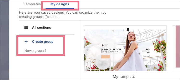 2. To access your templates, drag and drop a new section widget and go to My Designs. Here, you can group your templates.