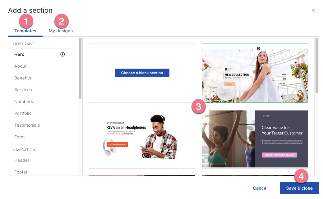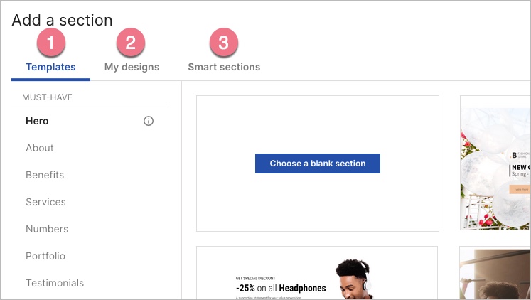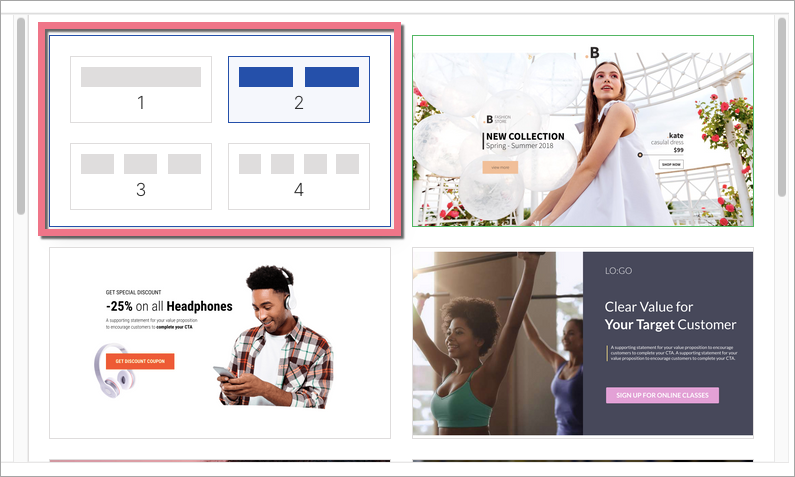 3. To choose a blank template, hover over Choose a blank section. Choose a section with one, two, three, or four columns.
