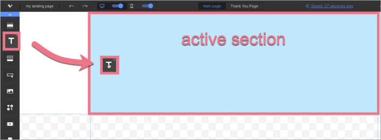 1. On the left side of the editor, find the Section widget, then drag and drop it into the active area of your landing page.