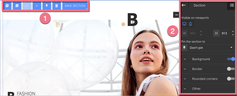 Click on the section to start editing. You will see its context menu (1) and toolbar on the right side of the editor (2).