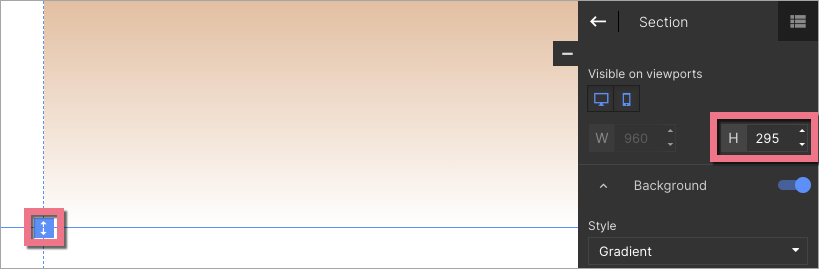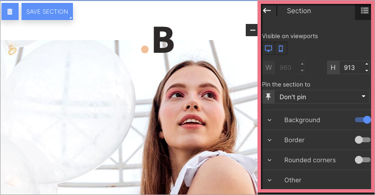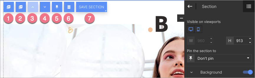In the widget toolbar, you can turn on/off mobile or desktop view (by default, the section is visible in both views), change the section height, and pin it (possible only with the first and last sections).