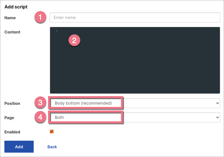 3. Type in a name (1) and paste the tracking tag in the Content (2) field. Choose the Body bottom (3) position on Both (4) pages. Click on Add.