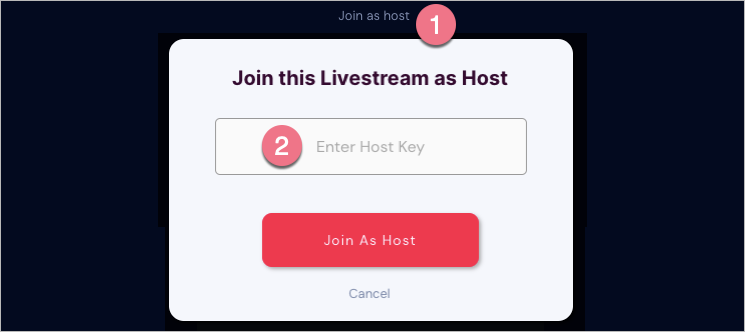 Open your stream and click Join as host (1). Enter the Host Key (2) from your Dashboard.