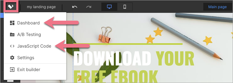 You can also access the Dashboard and the JavaScript Code section directly from the editor: