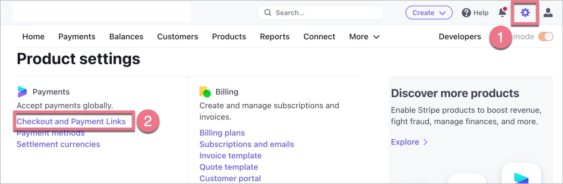2. Go to the Settings tab (1), in the Payments section, click on Checkout and Payment Links (2).