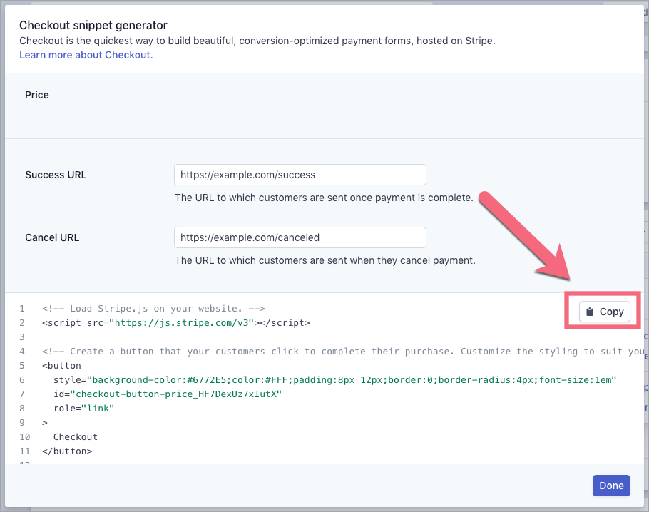 Get your HTML snippet from Stripe