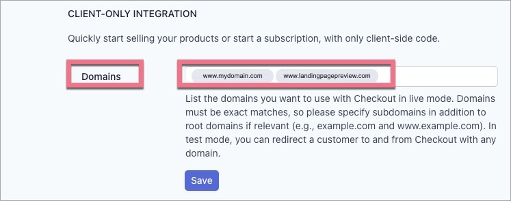 5. In the Domains section, paste the Landingi test domain name and the other domains or subdomains where the landing pages with one-time stripe payments will be published. Click on Save.