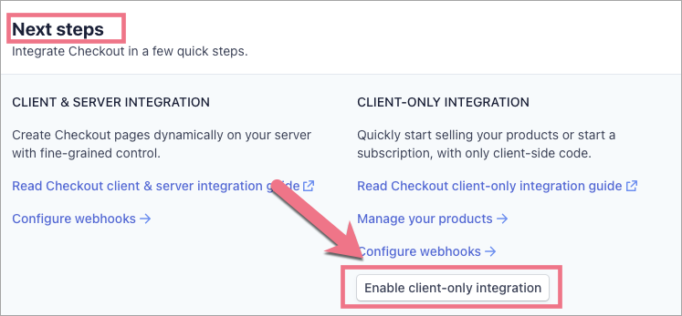 4. At the very bottom, in the Next steps section, click on Enable client-only integration to activate one-time payments. In the new window, click on Allow.