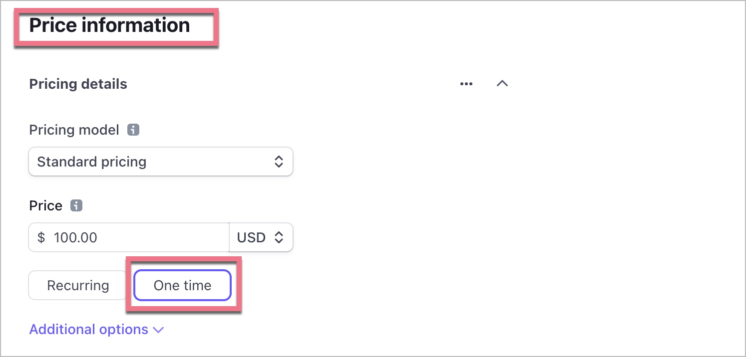 7. If you want to sell the product with a one-time payment, select One time in the settings under Price information.