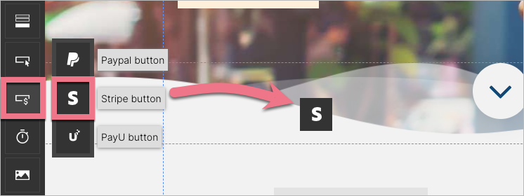 4. Now you can add a Stripe button to your landing page. On the left side of the editor, hover over the Pay buttons, then choose the Stripe button and drag and drop it into the active area of your landing page. Go to its Settings.