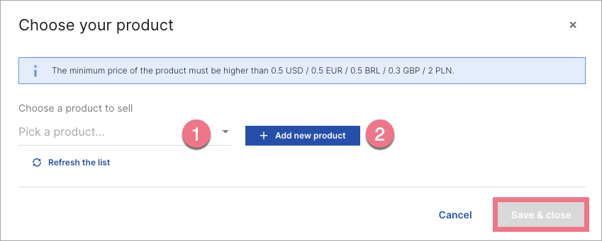 5. Select a product from the list (1) or add a new one (2) and refresh the list to link it to this payment gateway. Click Save & close. You can only add one product to a single payment gateway button.