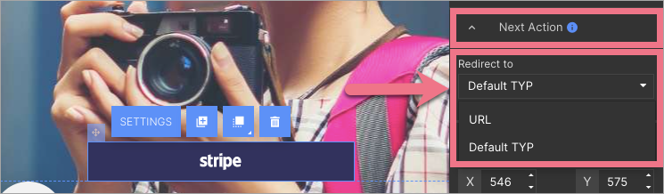 6. In the Next Action tab, you can specify an action after the payment has been made. By default, the user will be redirected to a thank you page (Default TYP), but if your landing page has multiple payment gateways or other signup forms, you can create and link (URL) a landing page that displays only after a transaction is completed.