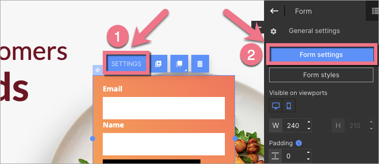 1. To choose the action after form submission, click on the Form and go to its Settings from the context menu (1) or the widget toolbar (2).