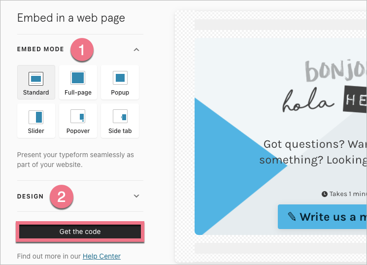 4. Configure embed mode (1) and design (2). Then click Get the code.