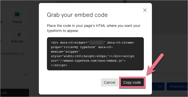 4. Paste the code from Typeform in the Add HTML code field. Then Save & close.